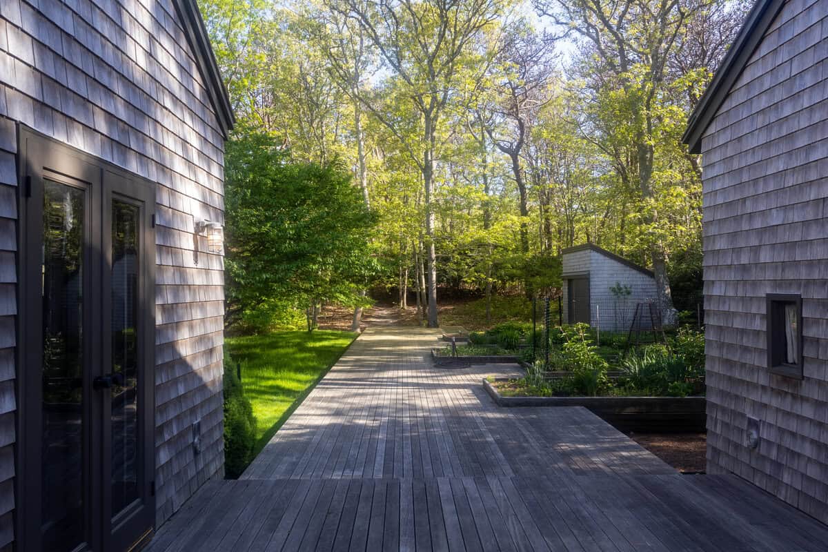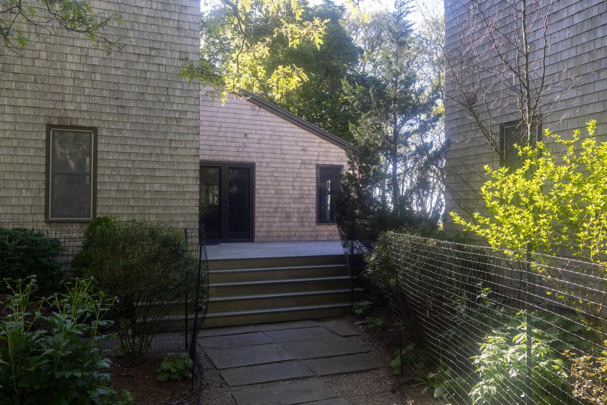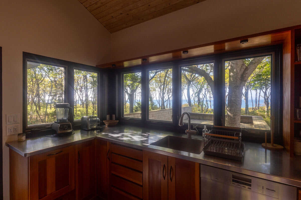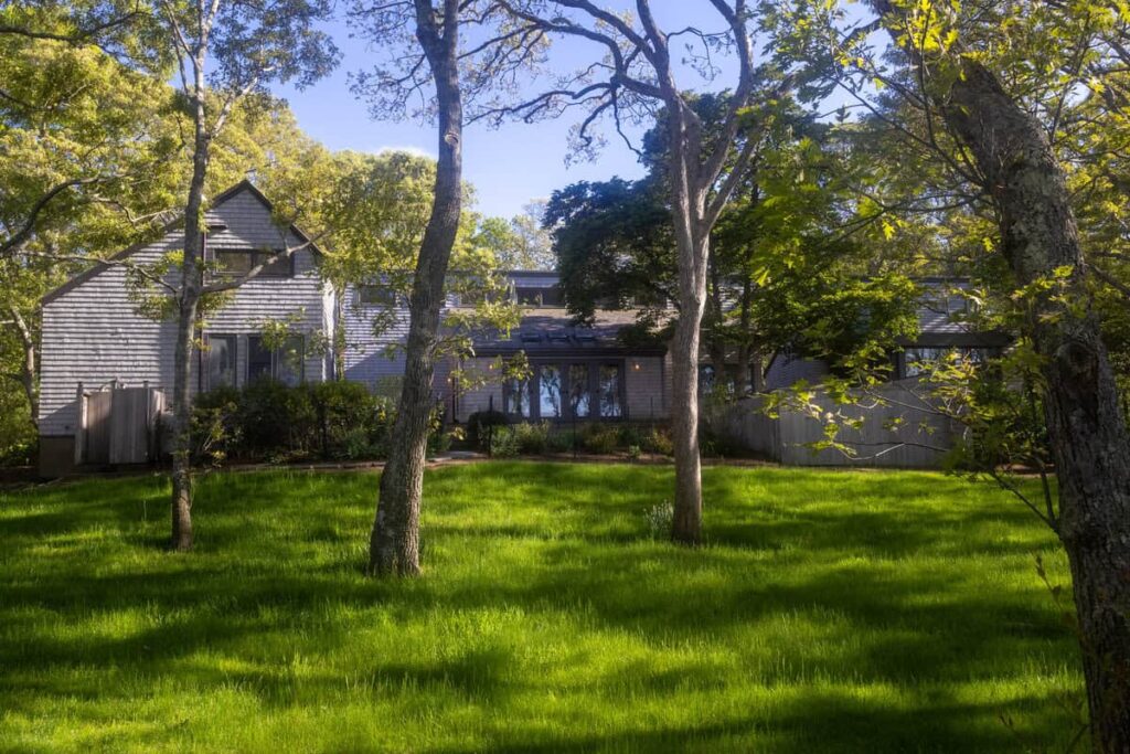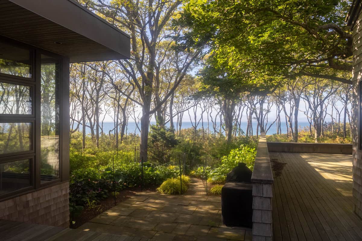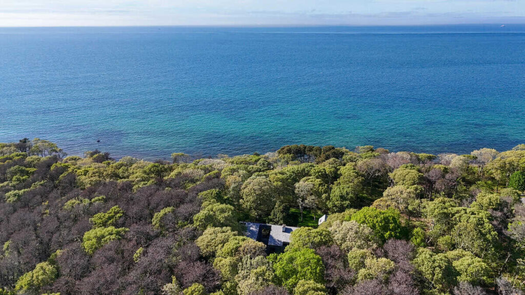 Tucked into the trees with sweeping views of the Vineyard Sound, this stunning compound offers an incredibly private and peaceful retreat. With three thoughtfully designed structures connected by a spacious deck, the property blends sophisticated coastal living with a deep connection to nature.