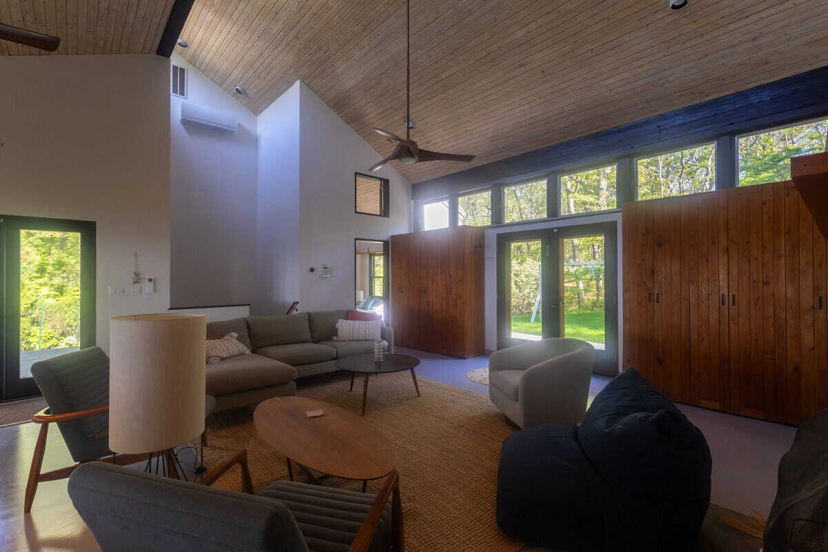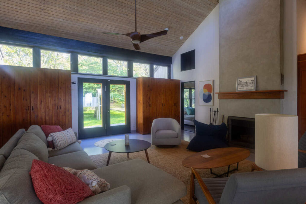 The main house features soaring ceilings, warm wood accents, and walls of glass that bring the outside in. It includes two ensuite bedrooms—one with a queen, the other with two twins that can convert into a king—plus a well-equipped kitchen, dining area, and a spacious living room with a fireplace, ideal for relaxing after a day on the beach.