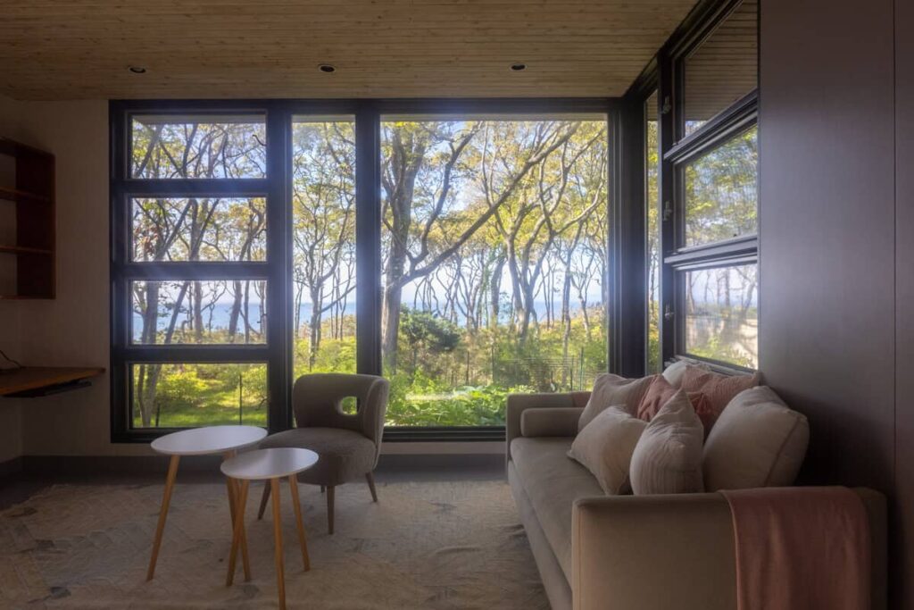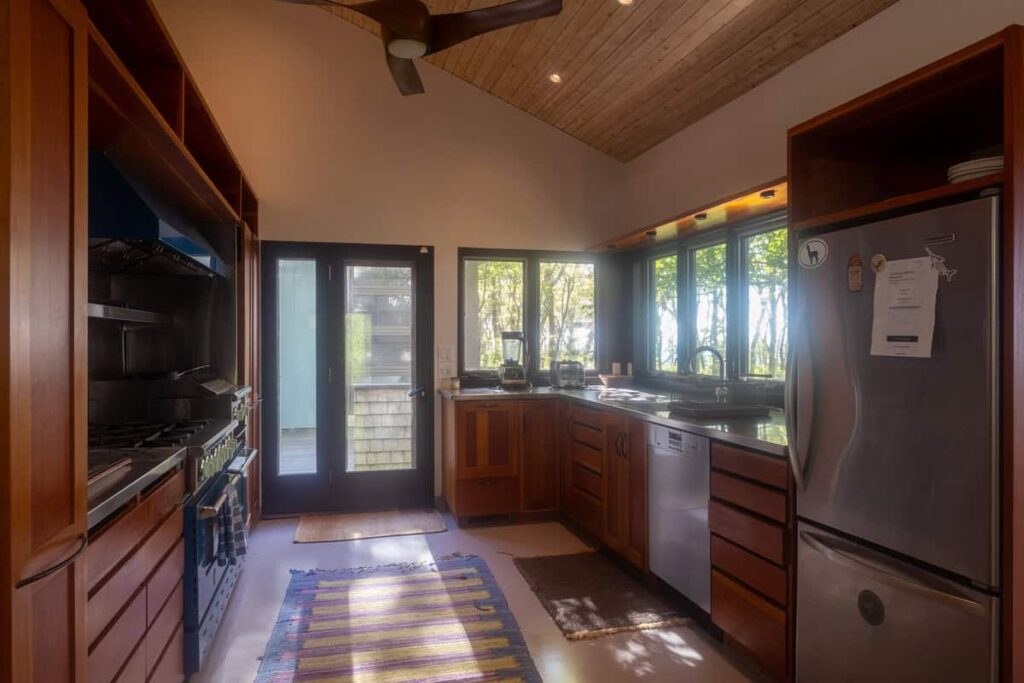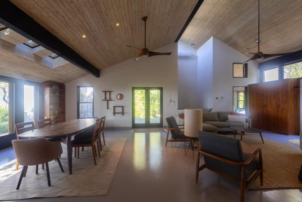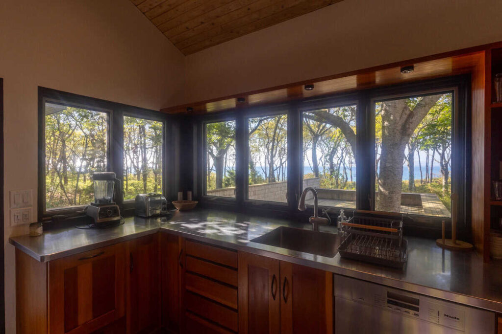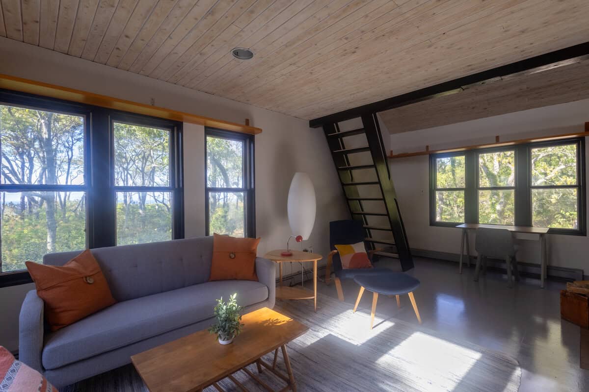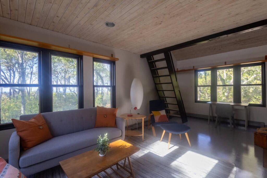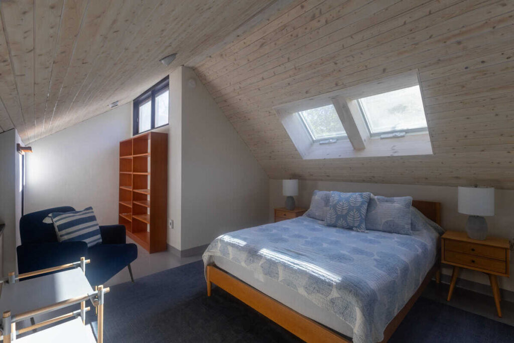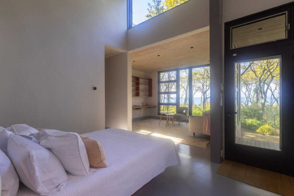 The third structure is a spacious studio-style suite with a queen bed loft, a larger living room with incredible light and views, a full bathroom, and a walk-in closet. Whether used as a writer’s retreat, guest quarters, or a quiet work-from-home setup, it’s a space that inspires.