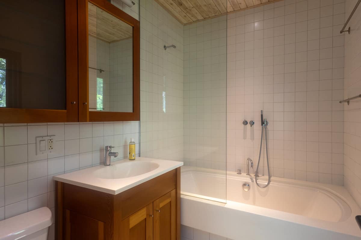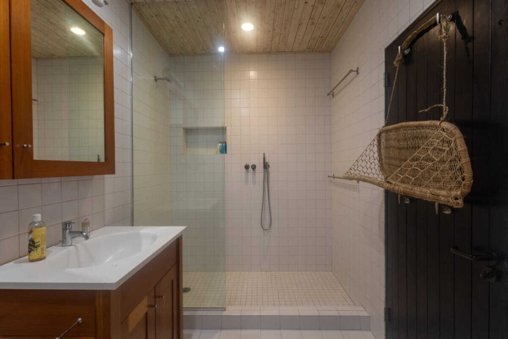 Step across the deck to a separate guest suite, where you’ll find a cozy living area, a beautiful wooden walk-in closet, and a serene queen bedroom with its own spa-like bathroom.