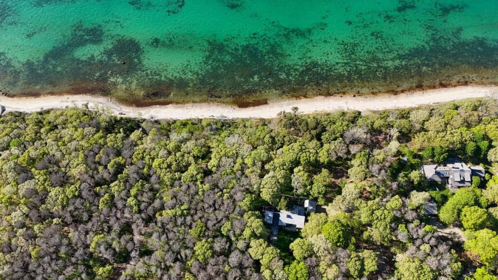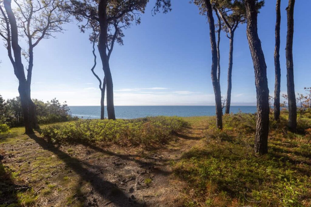 A private path leads you down through native greenery to the bluff, where the ocean stretches out before you—quiet, uninterrupted, and impossibly blue.