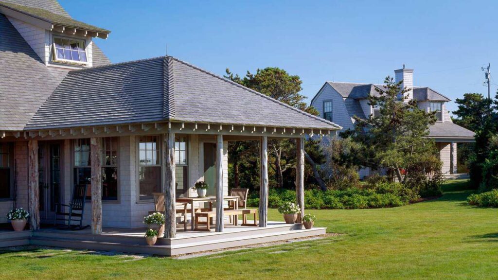 Just minutes from Edgartown Village yet entirely secluded, the home blends sophisticated design with relaxed island living. The main house is both architecturally striking and warm, with nearly every room framing panoramic views of Nantucket Sound. Fir floors, shiplap walls, and locust-post porches give the home a timeless Vineyard character, while modern comforts — including a fully equipped gym with steam shower and sauna — make it ideal for extended stays.