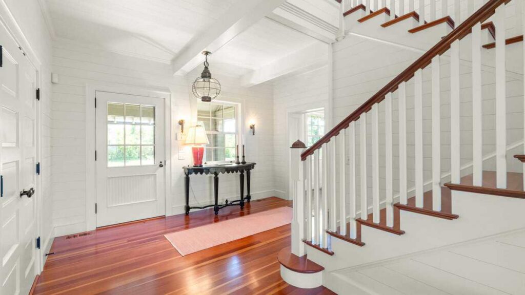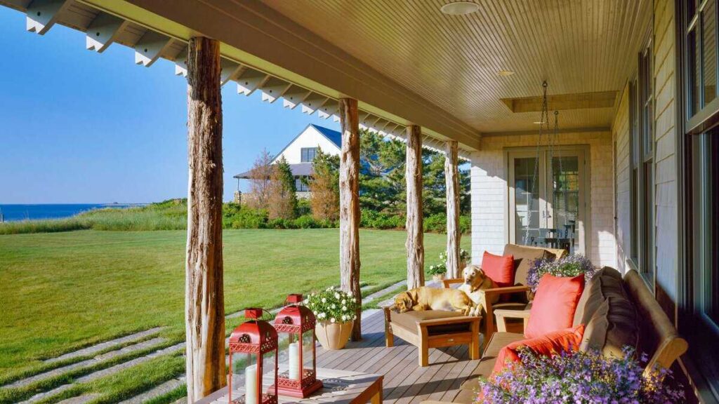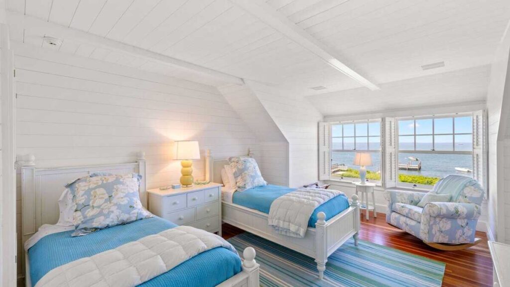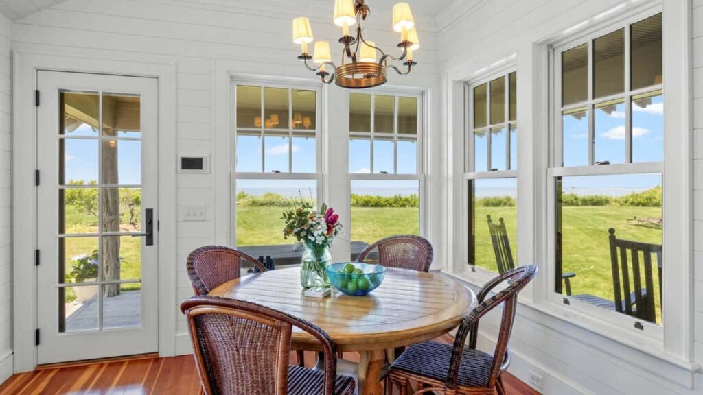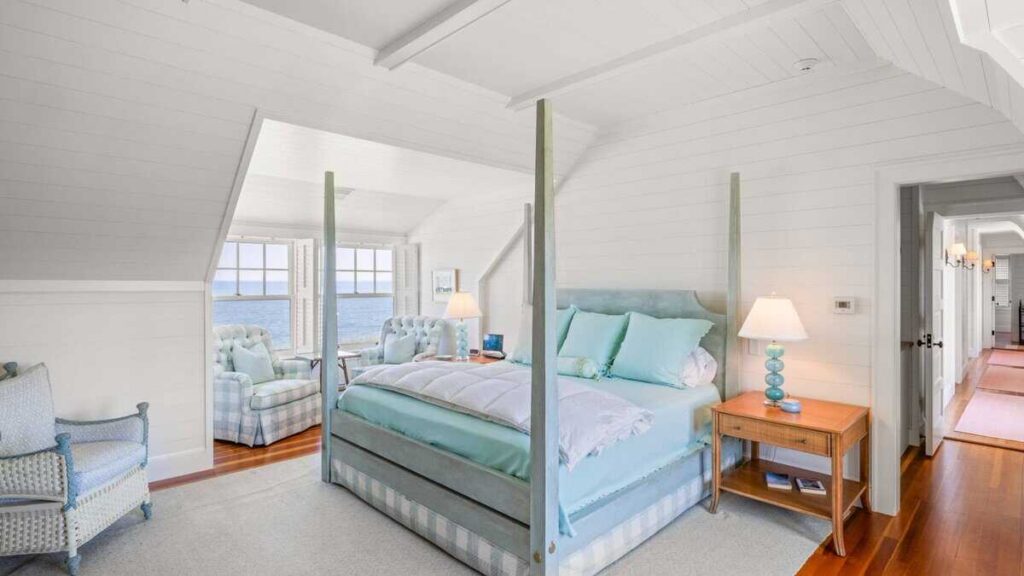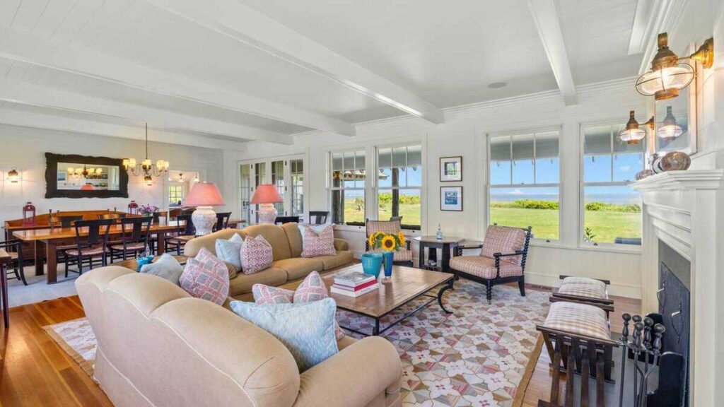 A sweeping great room with a long dining table invites effortless entertaining, and multiple porches and terraces offer space to gather or unwind. Outside, rolling lawns stretch to a private sandy beach, perfect for swimming, paddleboarding, or launching from the deepwater dock (accommodating boats with a 6–8 ft draft and two moorings). From here, enjoy a front-row view of regattas and golden sunsets that light up the Sound.