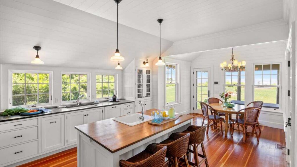 Featuring white cabinetry, warm wood accents, and a spacious center island. Large windows and French doors frame serene outdoor views, creating a cheerful space perfect for cooking, dining, and gathering