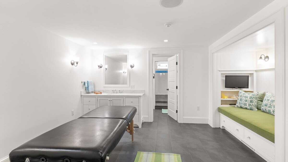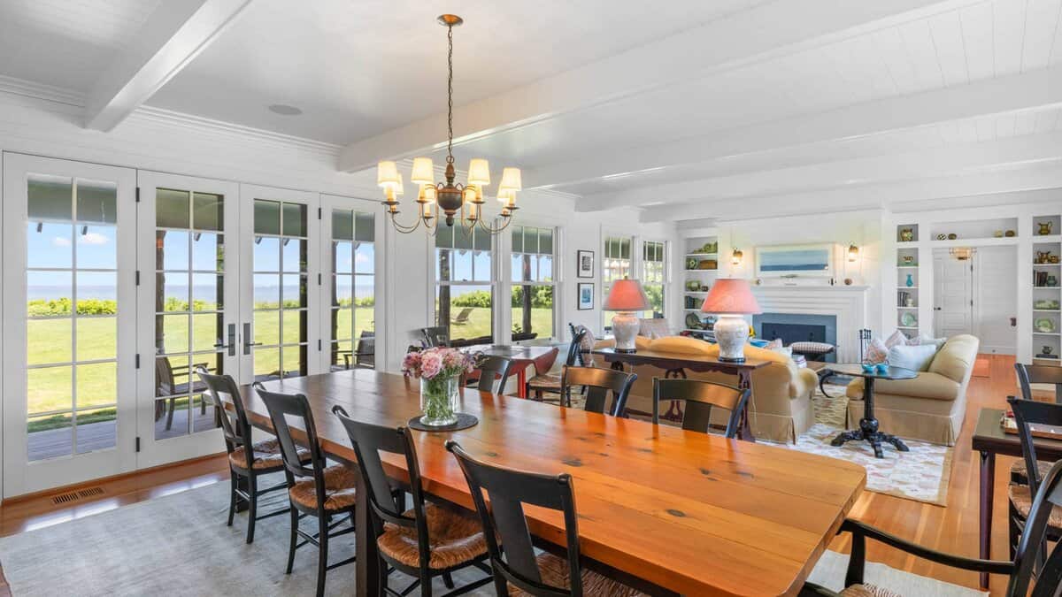 A sweeping great room with a long dining table invites effortless entertaining, and multiple porches and terraces offer space to gather or unwind. Outside, rolling lawns stretch to a private sandy beach, perfect for swimming, paddleboarding, or launching from the deepwater dock (accommodating boats with a 6–8 ft draft and two moorings). From here, enjoy a front-row view of regattas and golden sunsets that light up the Sound.