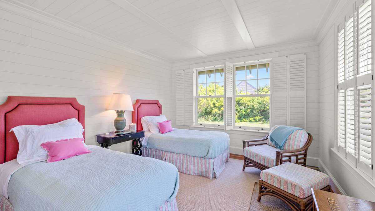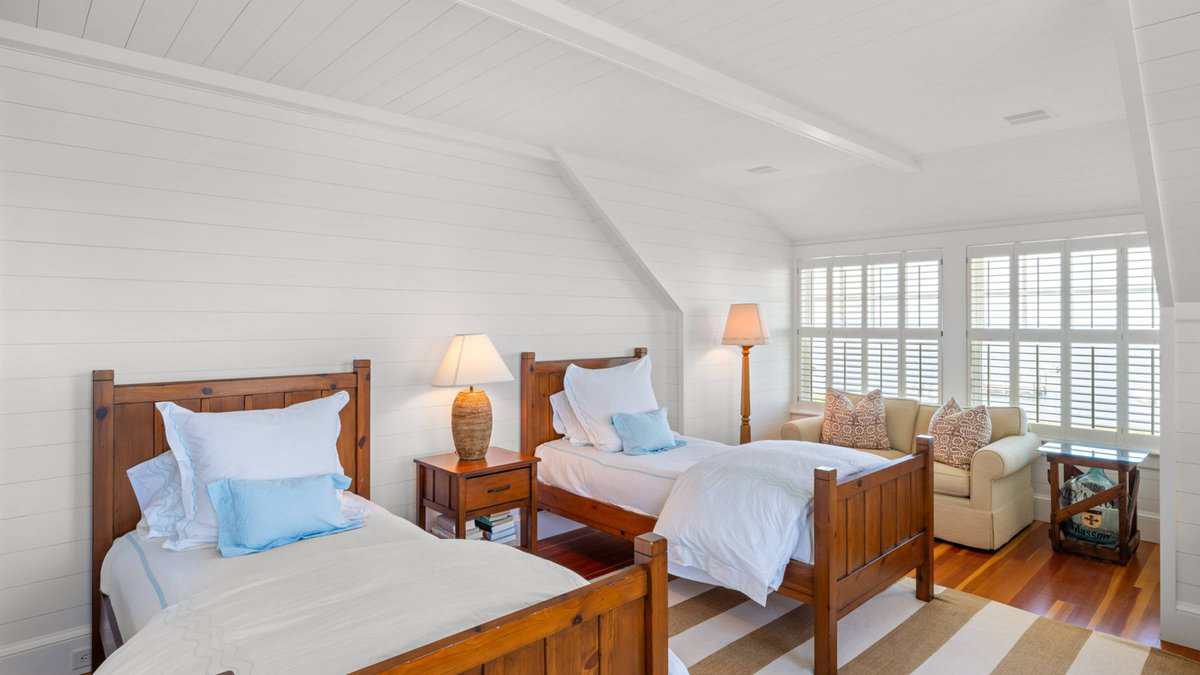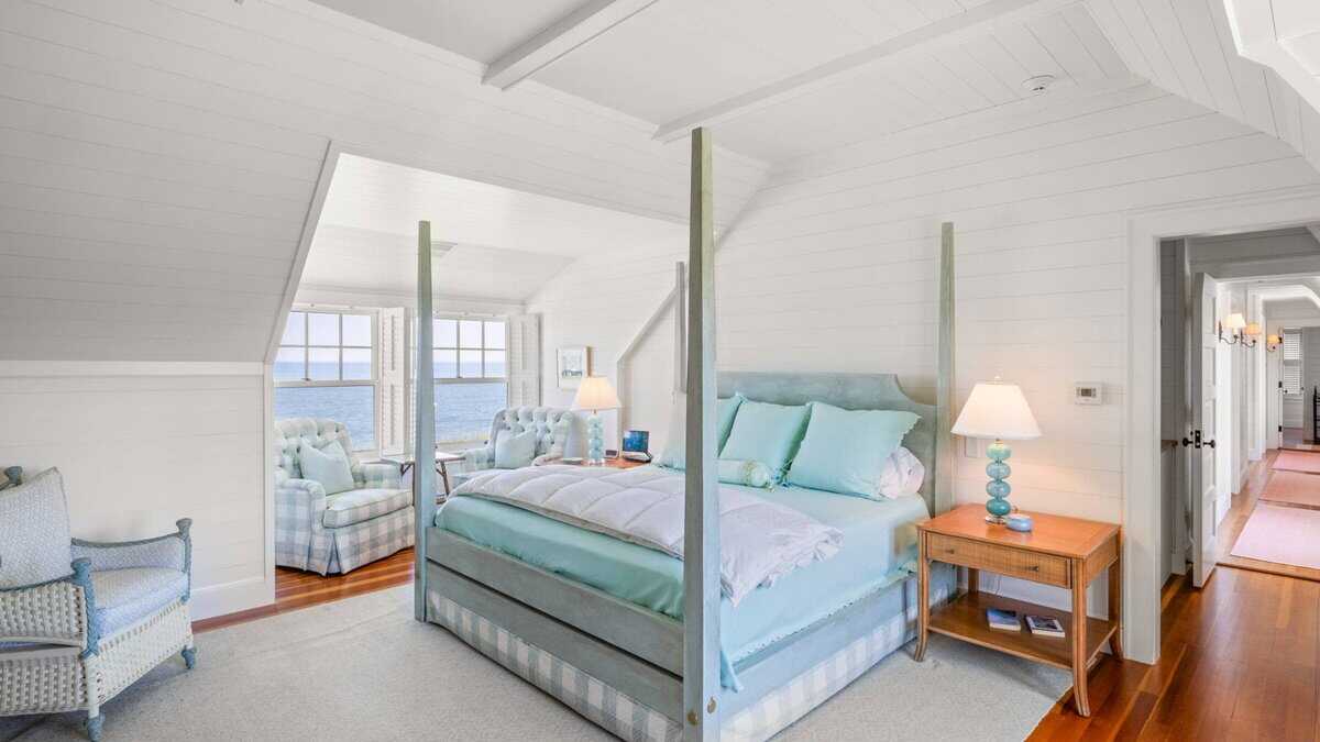 Just minutes from Edgartown Village yet entirely secluded, the home blends sophisticated design with relaxed island living. The main house is both architecturally striking and warm, with nearly every room framing panoramic views of Nantucket Sound. Fir floors, shiplap walls, and locust-post porches give the home a timeless Vineyard character, while modern comforts — including a fully equipped gym with steam shower and sauna — make it ideal for extended stays.